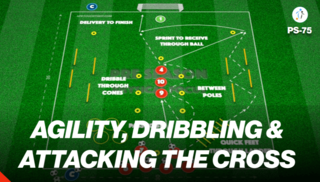 It's time to develop players' speed, agility and quickness in this pre-season practice. In this circuit, we have added game elements such as crossing and finishing to enhance players game feel while also increasing their overall fitness levels. We will work one side to start, with the next two players starting soon after keeping a good flow and intensity to the practice. Ensure players are playing well weighted passes out wide and attacking the deliveries at pace. 💪