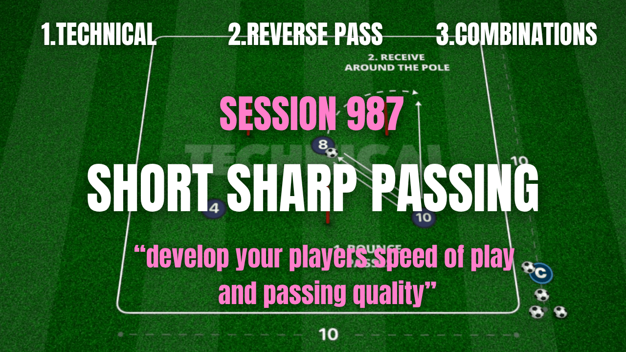 Session 987: Short Sharp Technical Passing focuses on developing quick combinations, clean first touches, and accurate passing under pressure. Players are encouraged to play with speed, adjust their body shape early, and connect efficiently in tight spaces.